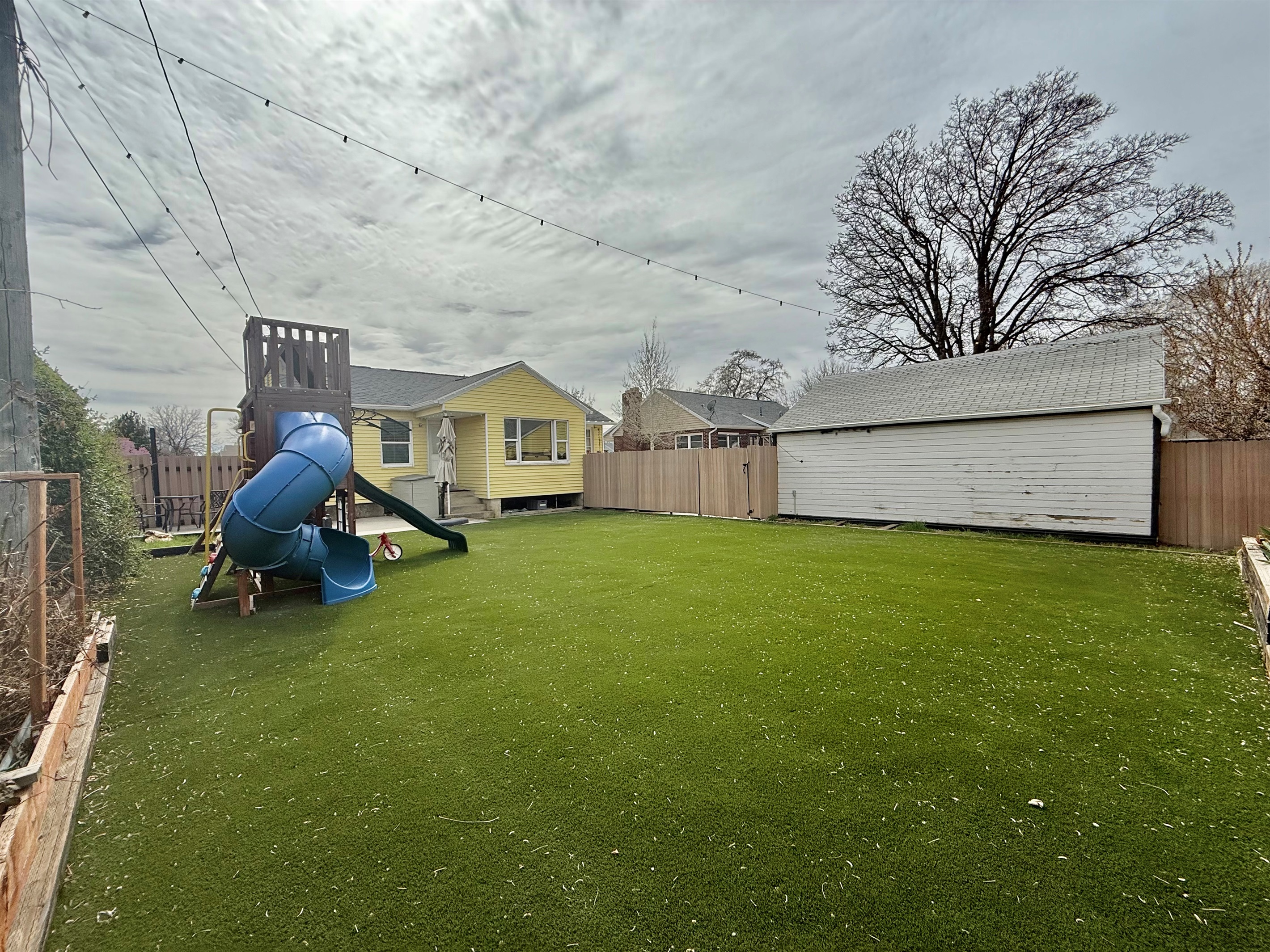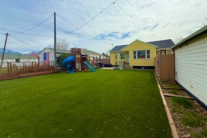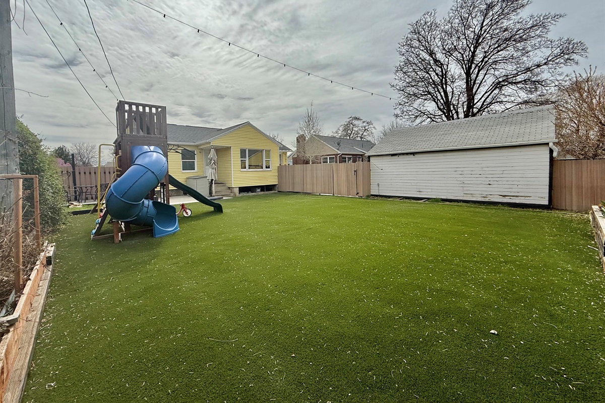 The large, fully fenced backyard is a standout feature, complete with artificial grass, outdoor games, and a children’s playset with swings, offering a safe and private outdoor space for everyone.