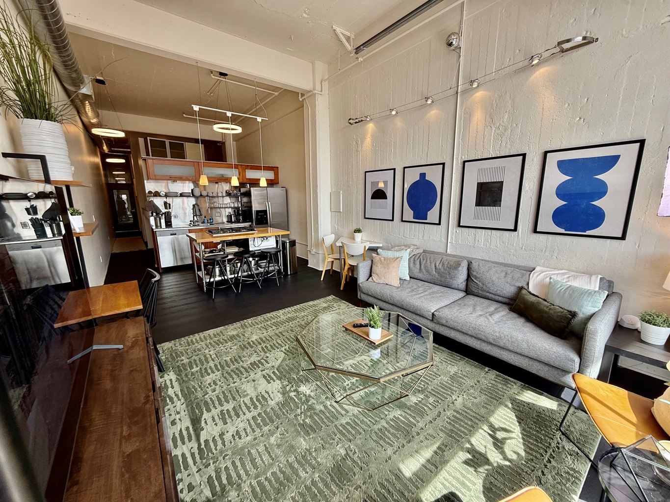 An open, loft style apartment. With lots of natural light in the day and a very industrial modern vibe.